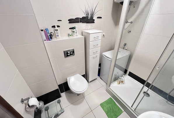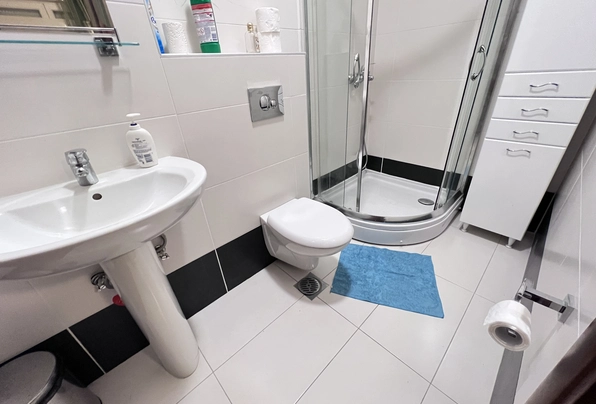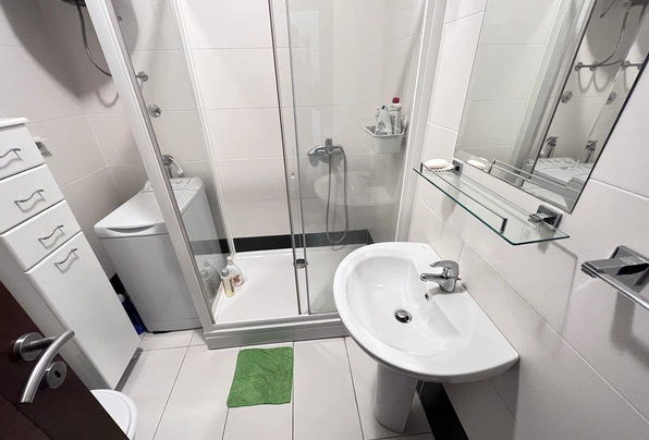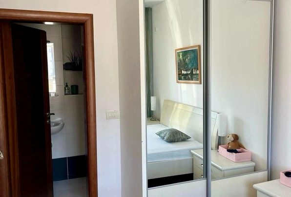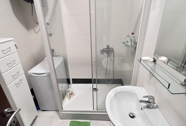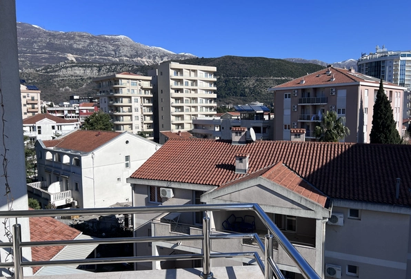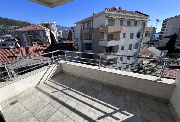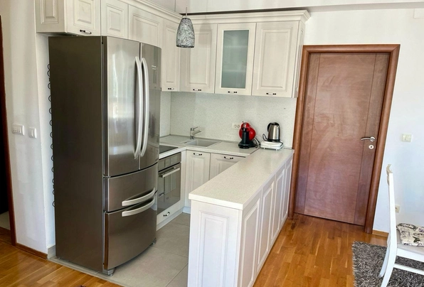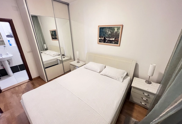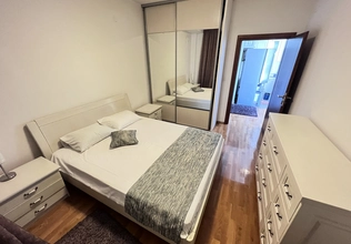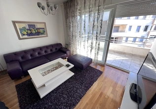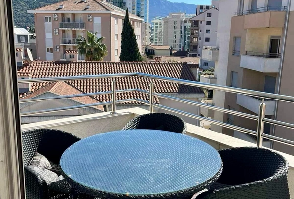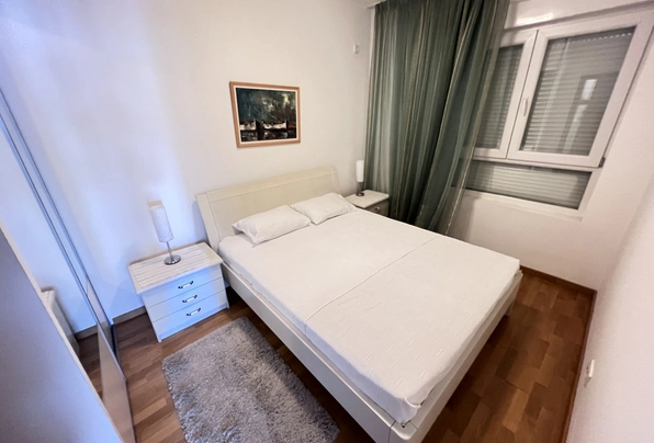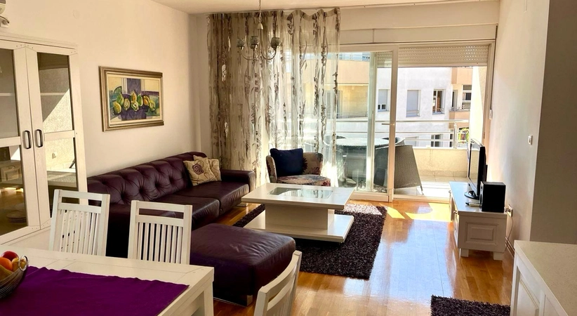 Budva Rental #6025. Two-bedroom apartment for year-round rent. 75 sq m, 4th floor with elevator. City center. Cafes, restaurants, shops, and the waterfront are within walking distance. The apartment has nice furniture and appliances. Large terrace. 2 bathrooms. Payment terms: first month, last month, and deposit. Utilities are included. Pets are not allowed on the property.