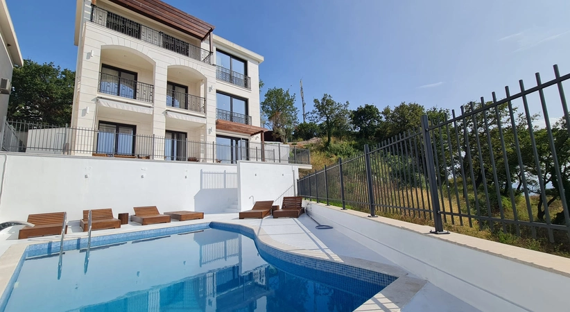 Selling ID3584. An exclusive luxury villa located in the prestigious village of Skochidevoika, Budva Riviera, is presented for sale. The property includes 5 bedrooms, with sea views from each bedroom, 4 full bathrooms and a separate guest toilet. A special feature of the villa are panoramic windows offering picturesque views of the island of St. Nicholas and the resort of Budva. During the construction of the villa, high-quality materials were used, which is reflected both in the decoration and in the creation of a unique interior. Along with elegance and comfort, the villa has a private pool and patio. This villa is ideal for connoisseurs of luxury and comfort who want to purchase property in one of the most exclusive areas. House area 300 m2, 5 bedrooms, 4 bathrooms and a guest toilet