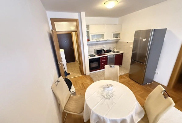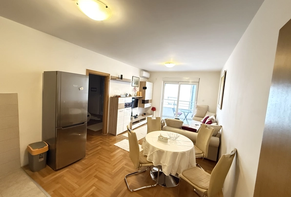 Sale Budva #5011. For sale one bedroom apartment. New building Merkur. Elevator. Floor 3. Parquet floor. The apartment has a large refrigerator, microwave, dishwasher, oven, fully furnished. Two terraces. Area 45 m2.