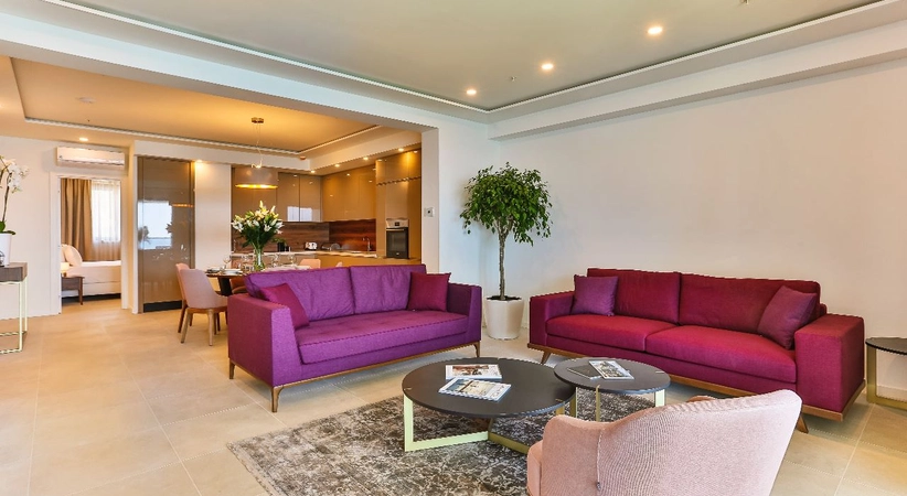 Sale Rafailovici #6097. Luxurious 2-bedroom apartment, 107 m2 in the new complex Rafailovici. The apartment is fully equipped with modern new furniture and appliances. 2 bathrooms. First line. The terrace offers panoramic views of the sea. The complex has a swimming pool, hamam, playground and 4 restaurants and bars. A great opportunity to buy luxury housing in the Budva Riviera!
