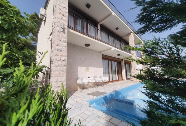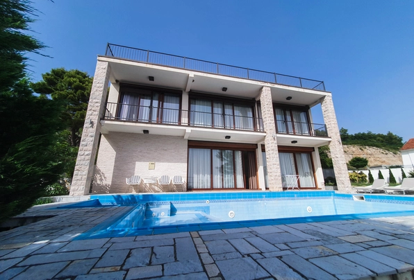 We offer for sale an exclusive premium villa with a swimming pool in the town of Bar in the Shushan area. - The area of the villa is 184 m2. - Garage 24 m2. - Land area 975 m2. - Swimming pool. - On two floors of the villa there are 3 bedrooms, a living room combined with a kitchen, 3 bathrooms (two showers, the third bathroom). - The villa has a security alarm system, video surveillance. - There is heating: fireplace, electric batteries 5 pieces. - Air conditioners in every room. - The villa is furnished and equipped with everything necessary for living: TV, refrigerator, microwave oven, electric stove and oven. - On the roof there is a large open-type terrace. - On the site there are green spaces: thuja, rose bush, fruit trees. - The villa offers a magnificent view of the sea and the port of the city of Bar. - Quiet place surrounded by pine trees. - Friendly neighbors from Russia and Serbia. - 15-20 minutes to the sea at a leisurely pace