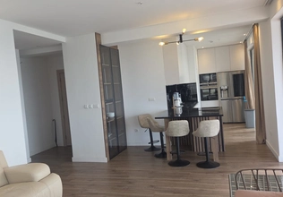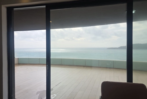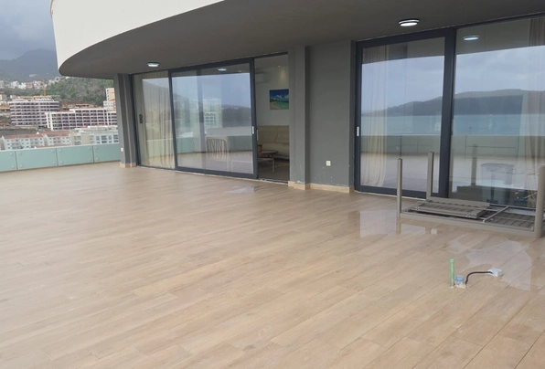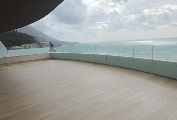 Rafailovići, #7530 for sale. Luxurious penthouse with 3 bedrooms, 2 bathrooms, 1 toilet, and a huge terrace with stunning panoramic views. 105 m² + 85 m² terrace. 10th-top floor, elevator, first line of the beach. The complex was completed in 2024. The apartment is sold fully furnished and includes appliances. Furniture from top Italian brands. Modern, high-quality appliances. Each room has a modern storage system and a split-system air conditioner. Underfloor heating throughout the apartment ensures comfortable living in the winter. An excellent offer for comfortable living and for renting out. No additional investment! A garage space can be purchased for €40,000.