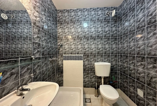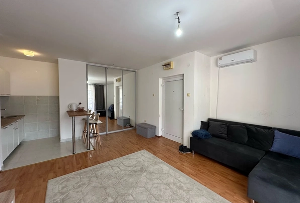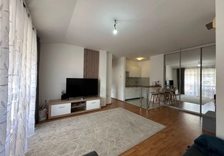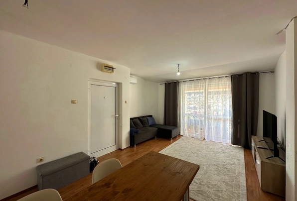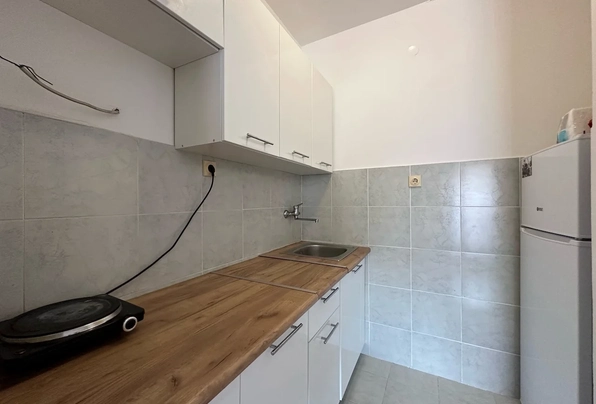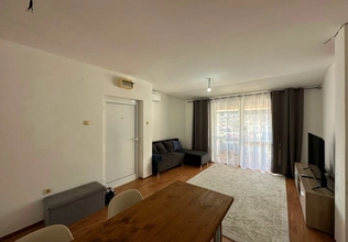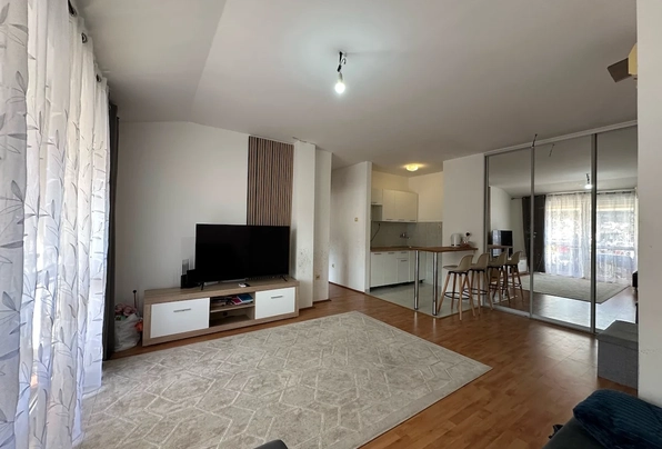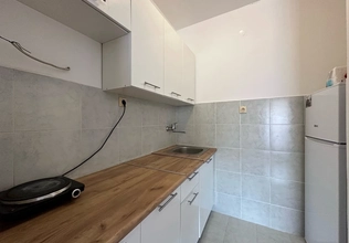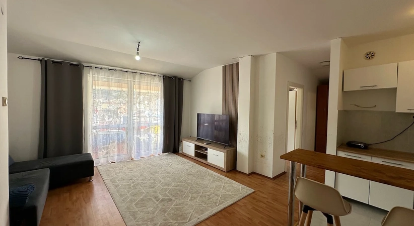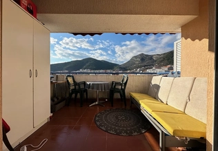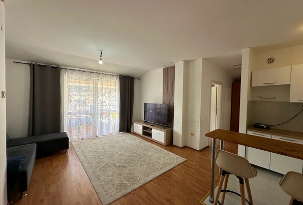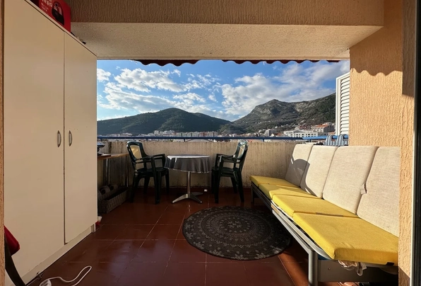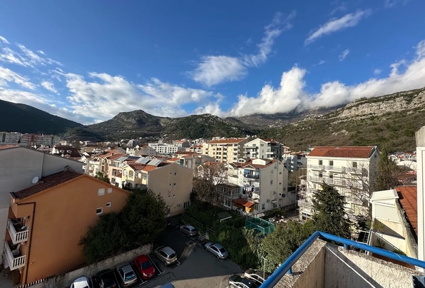 Budva for sale #7593. The apartment is on the top floor of a five-story building in the Adok neighborhood. This area boasts well-developed amenities, including a large supermarket, shops, a kindergarten, walking and recreation areas. The sea is less than 500 meters away. There is ample free parking in front of the building. The apartment is 50 m² and features a spacious living room, separate bedroom, kitchen area, and bathroom. The terrace offers panoramic views of Budva and the mountains. The interior is well-finished, with ceramic tiles, PVC windows, and high-quality plumbing. The apartment is partially furnished with new furniture and appliances. A fireplace can be installed.