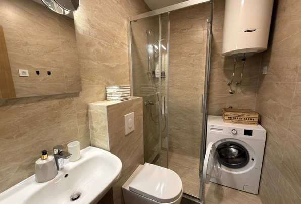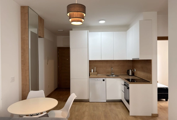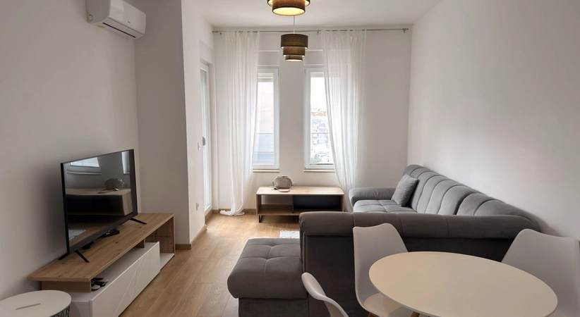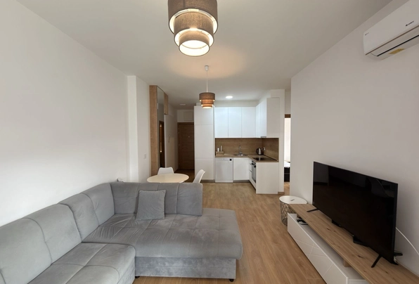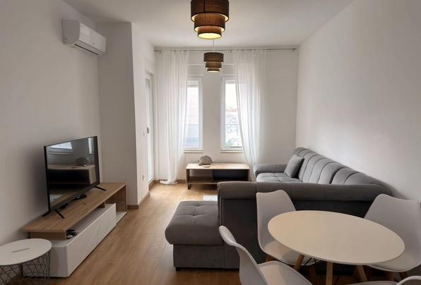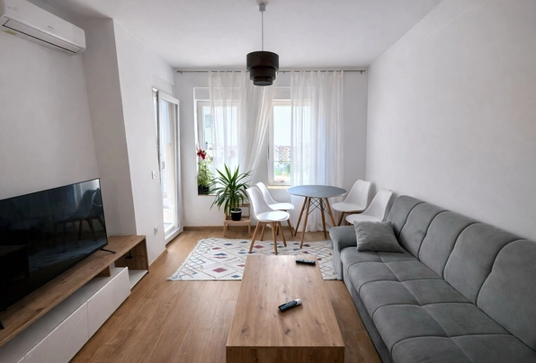 ID7760 for sale. This modern apartment in a new building features high-quality renovations, stylish, expensive furniture, and a full set of appliances and electronics. It features a convenient layout: 2 bedrooms, a bathroom, a spacious kitchen-living room, and a terrace with seating. Panoramic windows fill the space with light, and a split-system air conditioner and boiler are installed. The apartment is fully furnished and ready for occupancy. Free street parking is available near the building. Excellent location: just a 5-minute walk to the center of Budva, a large shopping center nearby, and a grocery store, cafe, restaurant, and beauty salon downstairs. The sea is a 20-minute walk away, Tivat Airport and Porto Montenegro are a 30-minute drive away, and Podgorica and Podgorica Airport are about an hour away. An ideal option for both living and investing.
