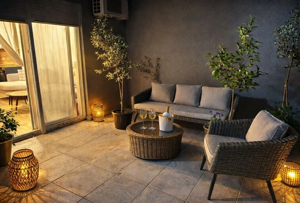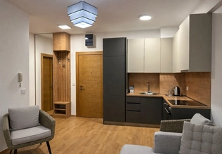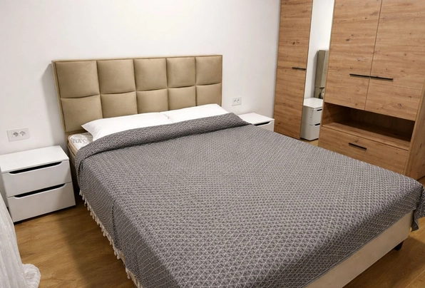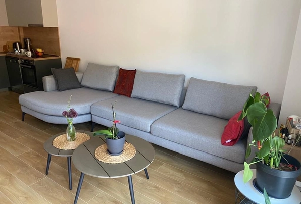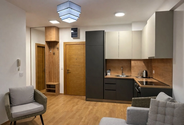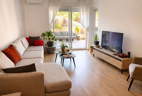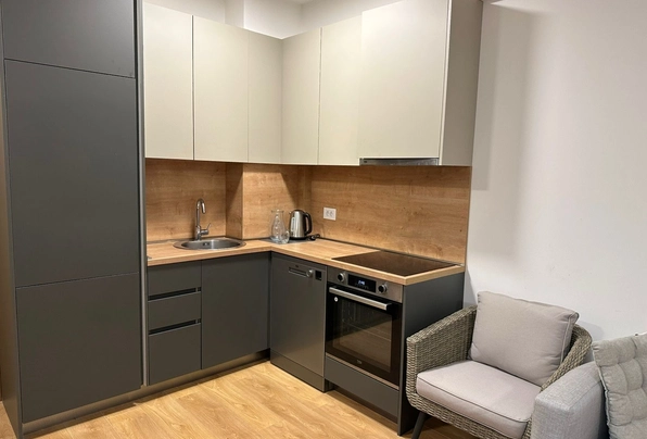 For sale ID7761. 43 m² + spacious 20 m² terrace — €155,000. This modern apartment features a well-thought-out layout: a cozy bedroom, a bathroom, and a bright kitchen-living room with access to a large furnished terrace, perfect for a barbecue area and a private green area for relaxation. The apartment has been recently renovated to a high standard, boasting modern furniture and appliances, panoramic windows that fill the space with natural light, and a split-system air conditioner and a boiler. The apartment is ready for occupancy, with free parking nearby. Excellent location: just a 5-minute walk to the center of Budva, nearby the MEGA MALL shopping center, with a grocery store, cafe, restaurant, beauty salon, and other amenities downstairs. The sea is a 20-minute walk away, Tivat Airport and Porto Montenegro are a 30-minute drive away, and Podgorica and Podgorica Airport are about an hour away. It's an ideal option for a comfortable life or a profitable investment by the sea.