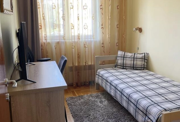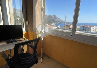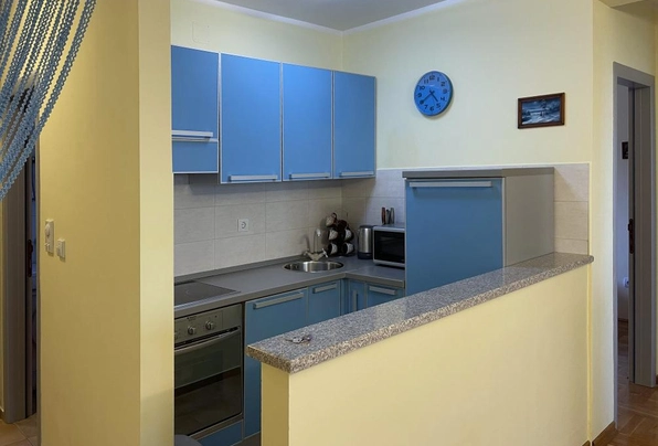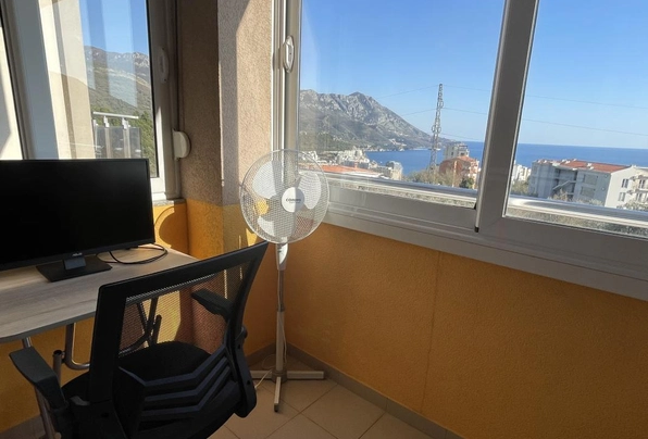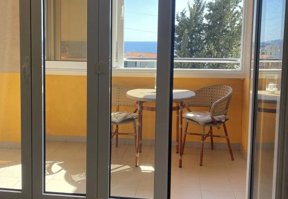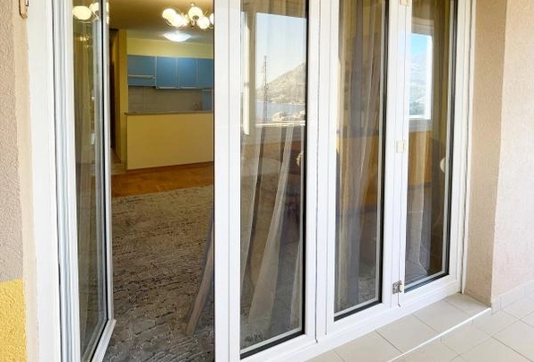 For sale in Becici #7773. A bright, 55 sq m apartment on the second floor, recently renovated and fully furnished. Features include: 2 bedrooms, a living room with a separate kitchen area (with panoramic glass sliding doors to the terrace), a bathroom with a window, an entrance hall, and a spacious glazed terrace with a charming panoramic sea view. All high-quality furniture and appliances are included. Windows face both sides and have protective blinds. Excellent location: a 12-minute walk to the beach and the Splendid Hotel, and a 5-minute walk to the nearest store. A quiet place with wonderful air and natural surroundings; friendly, welcoming neighbors. Shared parking. The apartment is legally registered.