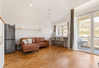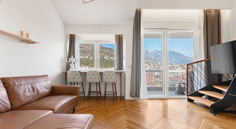 Tivat for sale #7857. This premium duplex apartment in the center of Tivat is for sale. Situated in the heart of Tivat, in a high-quality building with an elevator, the apartment was built in 2021 using the best construction materials and technologies. The area is 68 m². The apartment's layout: on the ground floor, there's a spacious kitchen-living room with access to the terrace, a bedroom, and a bathroom. On the second floor, there's another bedroom and an internal balcony. The apartment is fully furnished with premium furniture and appliances. Modern air conditioning and heating systems, heated floors in the bathroom, smoke detectors, and a security alarm are installed. The windows and terrace offer magnificent views of Mount Lovcen and Tivat Bay. Ceilings over 4 meters high create a feeling of spaciousness, while oak parquet floors, a beautiful internal staircase, and multi-level lighting complement the unique aesthetic of this apartment. The apartment is sold fully furnished and equipped. From the moment you step outside, you'll appreciate the benefits of living in the center of Tivat. All amenities are within walking distance: 1-2 minutes' walk to shops, banks, post office, beauty salons, restaurants, and cafes; 3-5 minutes to the sea, Pine promenade, and Porto Montenegro; 5-10 minutes to kindergartens, the municipal school, music school, and KSI English School. Public parking is available with the option of obtaining a resident parking permit in the center of Tivat. Clean documents, one owner, and quick transaction. This apartment is ideal for permanent residence, vacation rental, or investment.