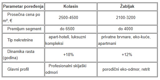 Tabela 3. Poređenje cena po kvadratnom metru u Kolašinu i Žabljaku (2026)
