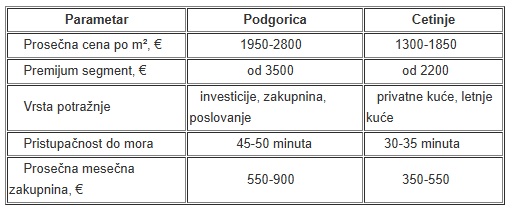 Tabela 4. Poređenje troškova i karakteristika (Podgorica naspram Cetinje, 2026)