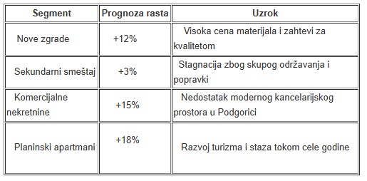 - Inflatorni pritisak: Rastući troškovi građevinskog materijala u EU direktno su uticali na troškove izgradnje u Crnoj Gori.Završetak velikih infrastrukturnih projekata: Otvaranje novih deonica autoputa Sever-Jug smanjilo je vreme putovanja od obale do skijališta, povećavajući cene u prethodno potcenjenim područjima.