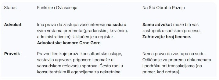 Više od 10 godina, GoMonte ima tim pravnih stručnjaka sa bogatim iskustvom u zastupanju klijenata u različitim pitanjima, od izrade dokumenata i podrške transakcijama sa nekretninama u Crnoj Gori do rešavanja sukoba i odbrane na sudu. U ovom članku ćemo detaljno objasniti kakvu pomoć advokat u Crnoj Gori može da pruži, zašto bi trebalo da ga kontaktirate, koje ključne veštine treba da poseduje i kako da pronađete najboljeg advokata u Crnoj Gori za zaštitu vaših prava prilikom kupovine nekretnina ili u drugim pitanjima.