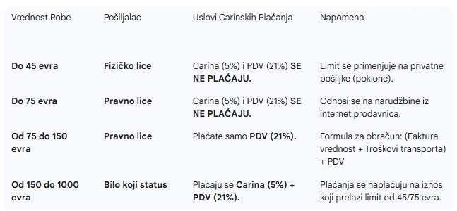 Za teret koji prelazi ograničenje bez carine, naknade se naplaćuju na sledeći način: ((Vrednost fakture + Troškovi transporta) + 5% Carina + 21% PDV).