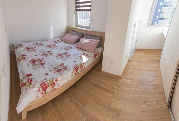 Budva Iznajmljivanje #7862. Jednosoban stan za dugoročni zakup. Nova zgrada, blizu autobuske stanice. 1. sprat. Lift.…