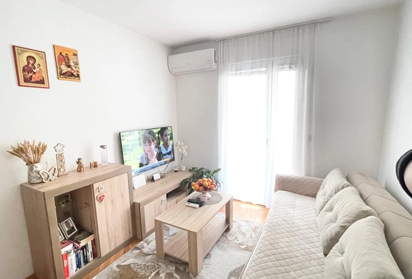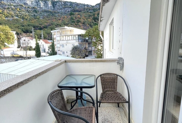 Budva na prodaju #7593. Stan se nalazi na poslednjem spratu petospratnice u naselju Adok. Ovaj kraj se može pohvaliti dobro razvijenim sadržajima, uključujući veliki supermarket, prodavnice, vrtić, pešačke i rekreativne zone. More je udaljeno manje od 500 metara. Ispred zgrade postoji dovoljno besplatnog parkinga. Stan je površine 50 m² i sadrži prostranu dnevnu sobu, odvojenu spavaću sobu, kuhinju i kupatilo. Terasa pruža panoramski pogled na Budvu i planine. Enterijer je dobro završen, sa keramičkim pločicama, PVC prozorima i visokokvalitetnim vodovodom. Stan je delimično opremljen novim nameštajem i aparatima. Može se ugraditi kamin.