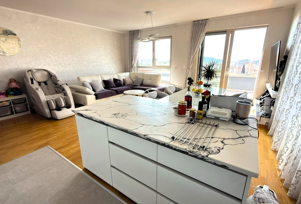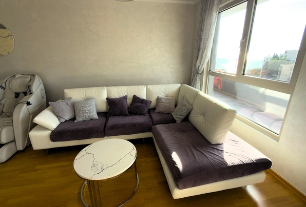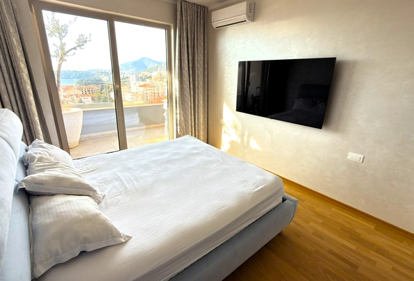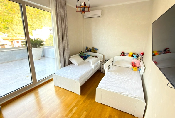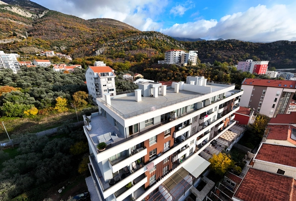 Na prodaju: ID7596. Ovaj moderan, potpuno opremljen stan sa zapanjujućim pogledom na more, privatnim garažnim mestom i ostavom se prodaje u novoj stambenoj zgradi (završenoj 2020. godine i useljenoj 2021. godine). Zgrada se nalazi u Bečićima, na samo 350 metara vazdušne linije ili 500 metara hoda od čuvene plaže Bečići. Penthaus se sastoji od dva nivoa: prvi nivo na 5. spratu nudi 104 m² neto unutrašnjeg prostora i 80 m² nameštene terase, dok drugi nivo nudi 279 m² krovne terase, koja se može prilagoditi i koristiti kao prostor za opuštanje. Ovaj trosoban stan sadrži prostrani ulazni hol, veliki dnevni boravak otvorenog plana sa trpezarijom, ostrvom i kuhinjom, glavnu spavaću sobu sa velikim kupatilom, dečiju sobu, radnu sobu (koja se po potrebi može pretvoriti u spavaću sobu), gosteinsko kupatilo sa kadom, veliku nameštenu terasu (80 m²) i veliku krovnu terasu od 279 m². Penthaus je opremljen najkvalitetnijim materijalima, vrhunskim kuhinjskim elementima, ugradnim elementima, rasvetom, vodovodom i multi-split sistemom klimatizacije. Podno grejanje je instalirano ispod svih keramičkih površina (u kupatilima i kuhinji) za dodatnu udobnost. Dnevna soba i prostrana terasa nude pogled na more koji se proteže od Zavale do Rafailovića, kao i na ostrvo Sveti Nikola. Cena ove nekretnine takođe uključuje garažni prostor od 15 m² i ostava od 25 m² u susednoj zgradi.