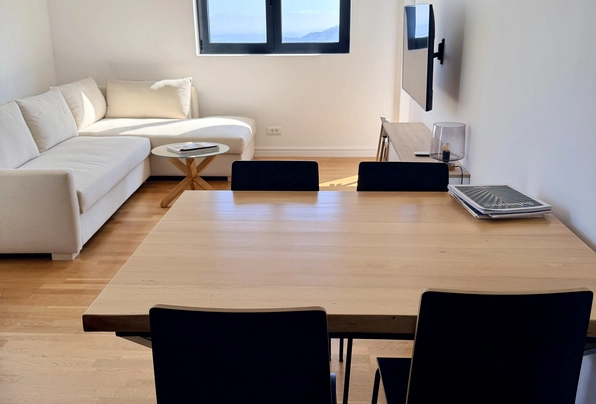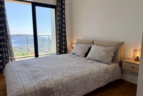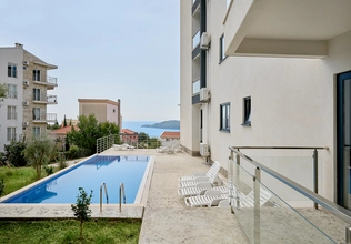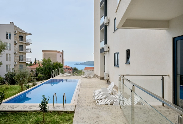 Bečići na prodaju, ID 7956. Stilski stan sa panoramskim pogledom na more u Bečićima na prodaju! 55 m², 2 spavaće sobe, kuhinja-dnevna soba, kupatilo, 3. sprat (lift). Kompleks nudi sve za vašu udobnost: bazen, saunu, teretanu i dečiju sobu. Ova nova zgrada odlikuje se visokokvalitetnom gradnjom i dobro održavanim dvorištem. Parking je uključen u cenu! Stan je potpuno opremljen visokokvalitetnim nameštajem i aparatima.