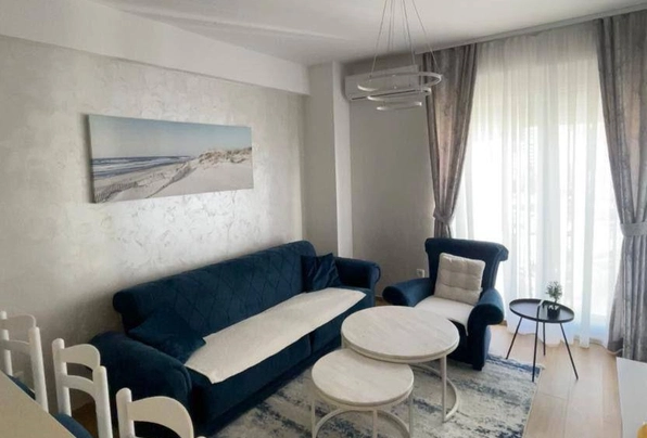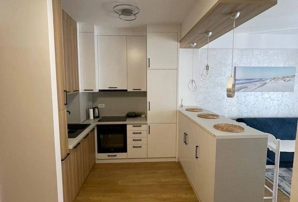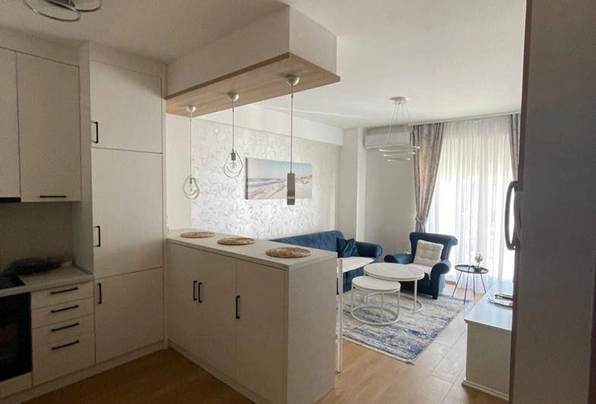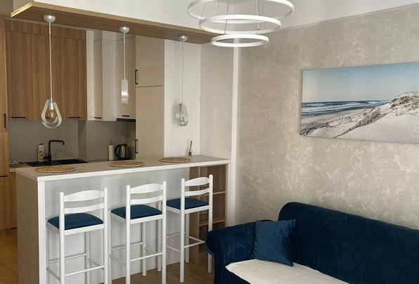 Аренда Будва №7678. Центр. Сдается квартира с 1 спальней на длительный срок. Площадь 50 м2. 6 этаж. Гостиная с кухонн…