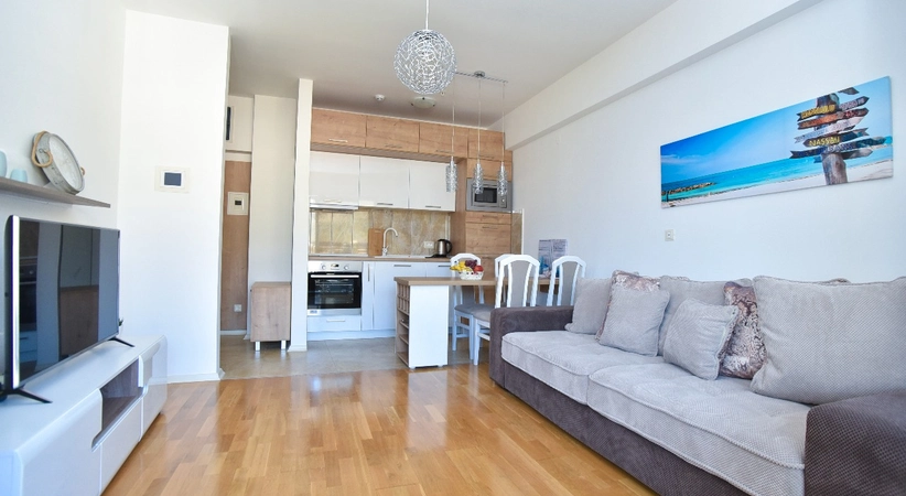Аренда Будва № 7187. На долгий срок квартира с 1 спальней в комплексе Гармония. В квартире современная новая мебель и бытовая техника. С террасы вид на море. До пляжа 5 минут. Условия оплаты: первый месяц, два последних и депозит. Счета отдельно.
