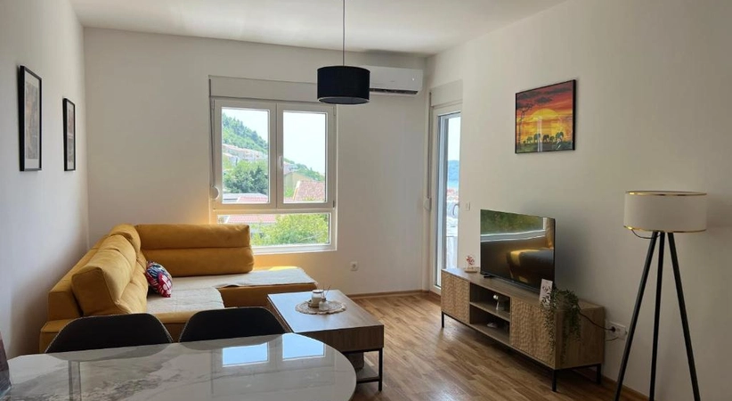 Аренда Будва № 7303. На долгий срок или до сезона до 1 июня 2026 г. квартира с 1 спальней или на год ,площадь 44 м2, новый дом. Квартира оснащена новой мебелью и бытовой техникой. С террасы вид на море. В цену включено гаражное место. Условия оплаты: первый месяц, последний и депозит. Счета отдельно. Домашние животные не разрешены.