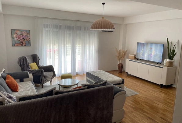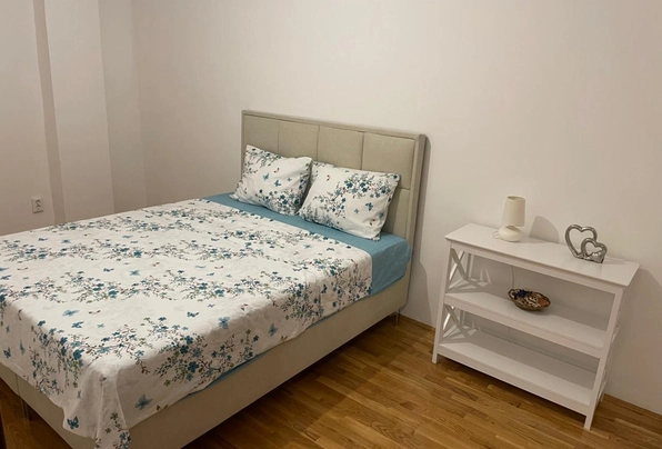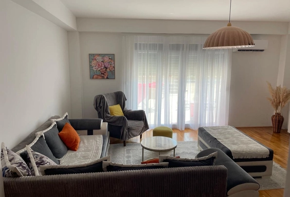 Аренда ID7360. Сдается комфортабельная двухкомнатная квартира площадью 113 м², абсолютно новая и ранее не заселенная, с современной мебелью и техникой. В квартире 2 ванные комнаты, 2 коридора, просторная гостиная, совмещённая с кухней и столовой зоной, 2 уютные спальни, а также большая терраса, накрытая бамбуком, с частичным видом на море. Жильё расположено в тихом районе без шума, всего в 5 минутах ходьбы от пляжа. Для удобства жильцов предусмотрены 2 парковочных места с шлагбаумами по обе стороны здания. Стоимость аренды составляет 900 € в месяц при долгосрочной аренде на весь год и 650 € в месяц при аренде до июня.