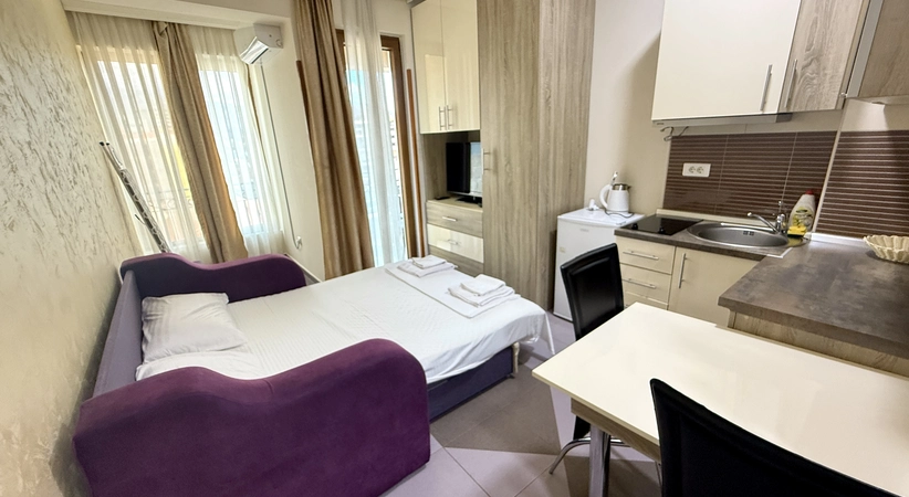 Аренда Будва №4466. Сдается студия до сезона. Большая застекленная терраса. Этаж 2. Новая школа.