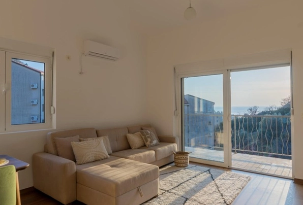 Продажа Пржно №2986. Продается квартира с 2 спальнями в Пржно. Вид на море. Свой паркинг. Находится немного выше отеля Резиденс. Этаж 2, без лифта. В стоимость входит гаражное место. Паркетный пол. Большая терраса. Полностью меблирована. Новый дом. Площадь квартиры 87м2.
