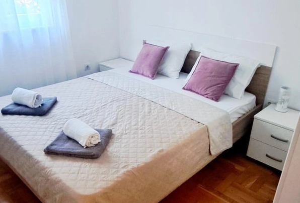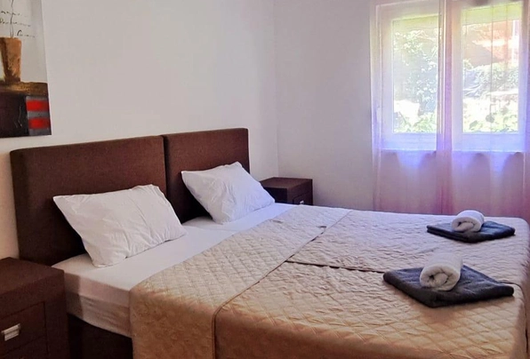 Продажа Будва № 7512. Продажа светлой, уютной квартиры с двумя спальнями и новым ремонтом август 2025. Общая площадь 64 м2, спальни 2, санузел 1, балкон 1 (+14 м2 не входит в общую площадь), бассейн, зона барбекю во дворе. Информация о доме: год постройки 2009, монолит Этаж: 1. Вид из окна: во двор. Гаражное место можно приобрести отдельно. Инфраструктура: до моря 1.2 км, магазин 140 м, школа 400 м.