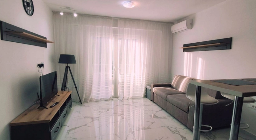Продажа Бар № 7562. Стильная квартира-студия площадью 33 м2 расположена на 2 этаже первой башни комплексе Emerald. Планировка: кухня, уютная гостиная с раскладным диваном-кроватью, современная ванная комната со стеклянной душевой кабиной, терраса с видом на горы и боковым видом на море. Полы покрыты керамической плиткой, имитирующей мрамор, в коридоре и ванной комнате установлен подогрев пола. Большие панорамные окна наполняют пространство светом и теплом, а кондиционеры Fujitsu обеспечивают комфорт круглый год. Комплекс расположен в тихом и спокойном районе, всего в 20 минутах ходьбы от моря и в 10 минутах от центра Бара. Благоустроенная территория площадью включает в себя променад, бассейн, детскую площадку, парковку и ухоженные зеленые насаждения.