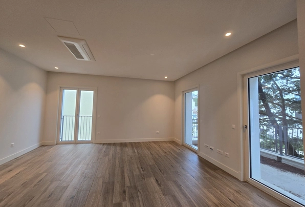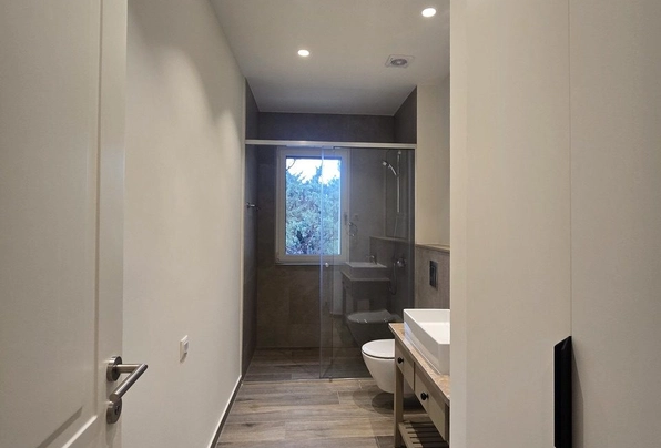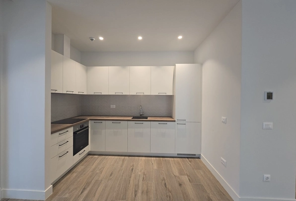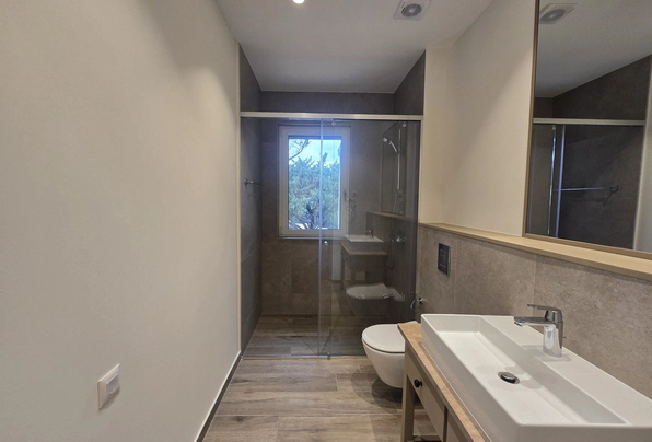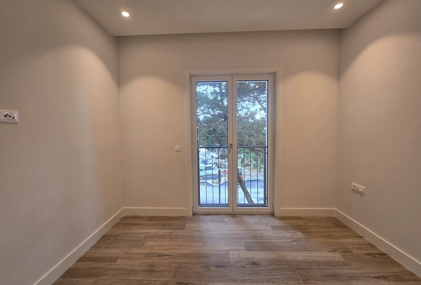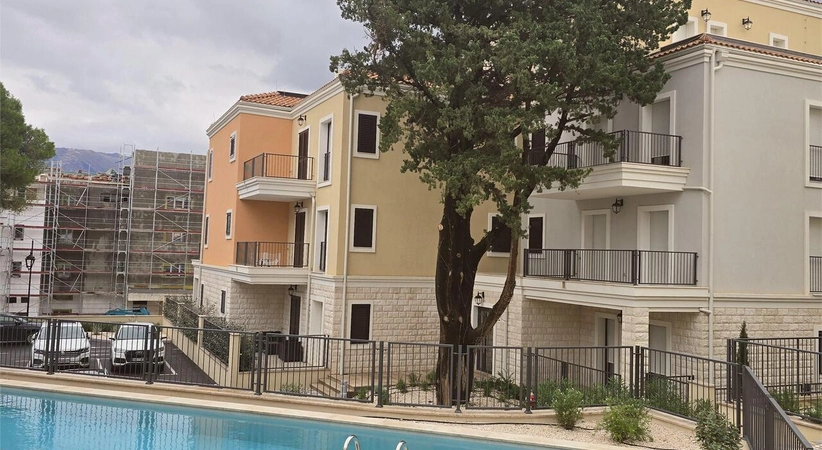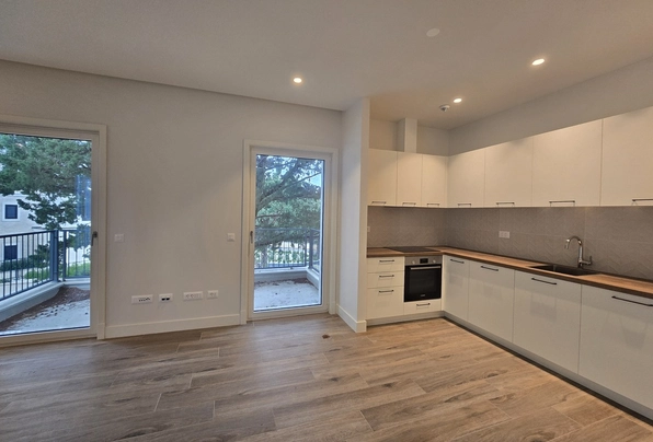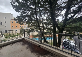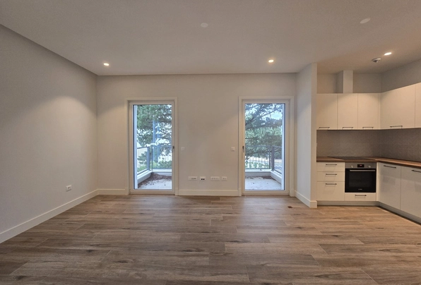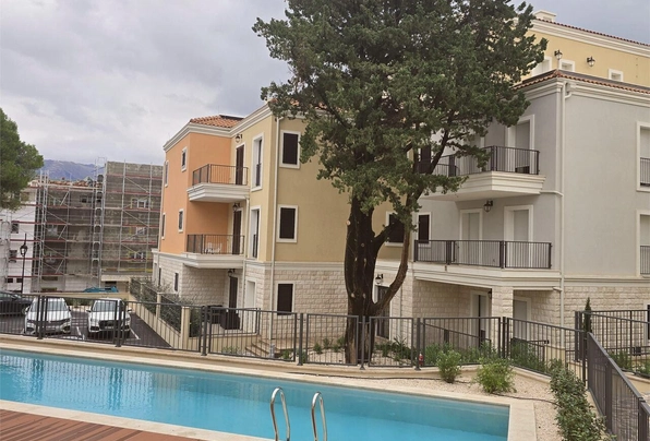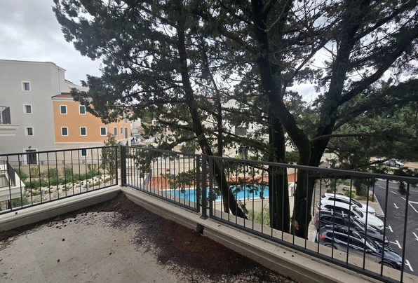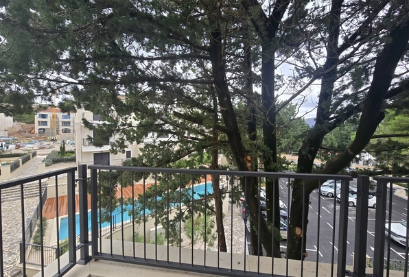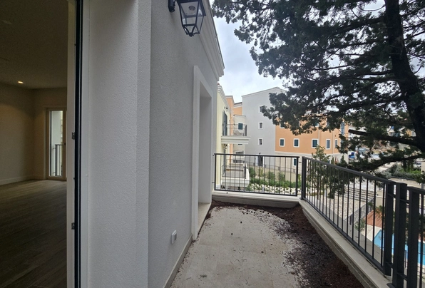 Продажа Луштица № 7835. Lustica Centrale — Новая квартира с 1-й спальней в блоке с бассейном. Площадь квартиры — 69 м². Планировка: прихожая зона, большая ванная комната, гостиная с встроенной кухней, спальня. Терраса с видом на бассейн. Квартира очень светлая, большие панорамные окна, в гостиной 2 выхода на террасу, французский балкон в спальне. Из окна спальни частичный вид на море. Жилой блок с бассейном находится в минуте ходьбы от главной площади Lustica Centrale — Piazza. Вместе с квартирой продается гаражное место — 20.000 евро.