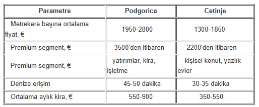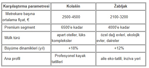 Tablo 3. Kolašin ve Žabljak'ta metrekare fiyatlarının karşılaştırılması (2026)