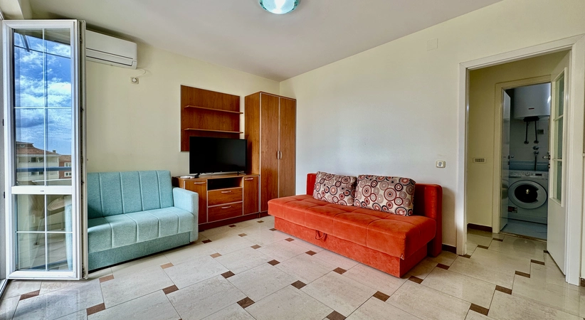 Satılık Rafailovici No. 4330. Satılık asansörü olmayan bir binada 1 yatak odalı daire. 5. katta, deniz manzaralı, güney cepheli teras. Sezonda yüksek kiralama potansiyeli, denize 2 dakika mesafede